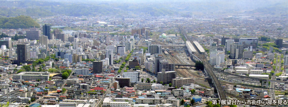 南方面は、弁天山から市街地とJR福島駅、西の安達太良連峰も一望できる。
